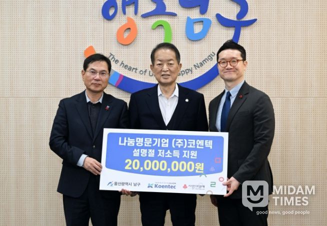 미담타임스 김준완 기자 | 울산 남구의 대표적 향토기업인 ㈜코엔텍(대표 김재일)은 2일 남구청을 방문해 관내 저소득층 지원을 위한 성금 2,000만 원을 전달했다.