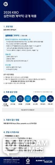 이번 채용은 KBO 야구심판 양성과정 수료자(2026년 야구심판 양성과정 수료 예정자 포함) 또는 대한야구소프트볼협회(KBSA) 및 산하단체, 독립리그 소속 심판으로 1년 이상의 심판 활동 경력(단체장 직인 필수) 보유자에 한해서 지원이 가능하다. 최종 합격자는 2026 KBO 공식 심판위원으로 활동하게 되며, 근무 종료 후 평가 결과에 따라 정규직 전환이 검토된다.