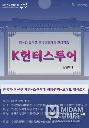 미담타임스 김교환 기자 | 대구 수성문화재단은 올해 2월부터 11월까지 대구·경북 외국인 유학생을 대상으로 한국문화체험 현장학습 ‘K헌터스 투어’를 운영한다.