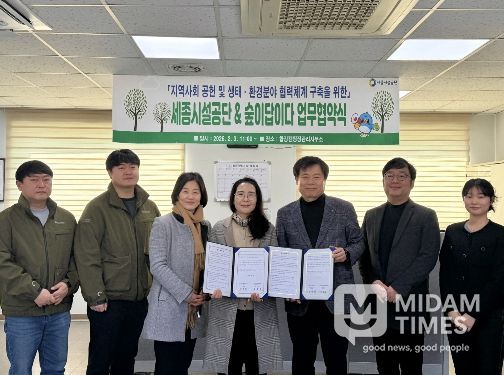 미담타임스 김준완 기자 | 세종특별자치시시설관리공단은 3일, 합강캠핑장에서 산림복지서비스 전문기관 ㈜숲이답이다(대표 강경희)와 지역사회 공헌 및 생태·환경 분야 협력체계 구축을 위한 업무협약을 체결했다고 밝혔다.