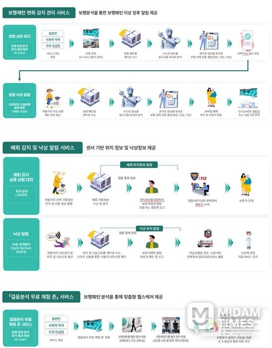 한편, '사물 인터넷(IoT)기반 스마트신발을 활용한 사회적약자 지원서비스 사업'은 65세 이상 고령자 500명을 대상으로, 보행 측정이 가능한 스마트센서(자이로센서-보행 분석, GPS센서-위치정보)가 부착된 스마트신발을 보급해 보행 패턴 변화를 관리하는 실증 서비스다.