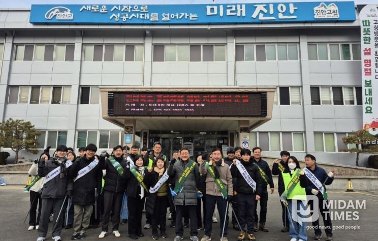 미담타임스 김준완 기자 | 진안군은 설 명절을 앞두고 4일, 군청 환경과와 진안읍 행정복지센터 직원 60여 명이 참여한 가운데 진안읍 시가지 일원에서 환경정화활동과 생활쓰레기 저녁시간 배출 캠페인을 추진했다.