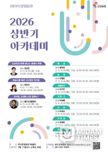 미담타임스 김교환 기자 | (재)부산문화회관은 오는 3월 9일부터 7월 1일까지 2026년도 상반기 정규 아카데미 강좌를 개설한다.