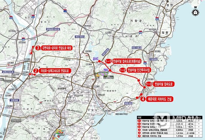 4개 사업은 총 6천539억 원 규모로, ▲반송터널 ▲의성로~남해고속도로 연결도로 ▲강변대로~금곡로 연결도로 확장 ▲해운대로 지하차도 건설 사업이다.