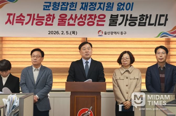 미담타임스 김준완 기자 | 김종훈 울산 동구청장은 2월 5일 오전 10시 40분 동구청 프레스센터에서 기자회견을 갖고 "균형잡힌 재정지원없이 지속 가능한 울산 성장은 불가능 하다"라며 울산시가 관련 조례를 개정해 자치구가 안정적으로 재원을 확보하는데 앞장 서 줄 것을 촉구했다.