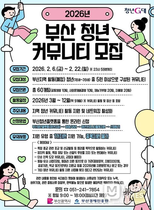 미담타임스 김교환 기자 | 부산시는 오늘(6일)부터 2월 22일까지 '2026년 청년 커뮤니티 활동 지원 사업' 참여팀을 모집한다고 밝혔다.