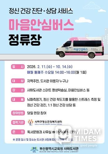 미담타임스 김교환 기자 | 부산광역시립사하도서관은 오는 2월부터 10월까지 매월 둘째 주 수요일마다 도서관 스마트 평생학습실과 마을안심버스에서 지역주민을 대상으로 ‘마을안심버스 정류장’을 운영한다.