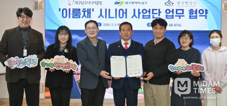 미담타임스 김교환 기자 | 대구 남구는 지난 2월 5일 남구청 4층 회의실에서 대구남구시니어클럽(관장 김상희), ㈜엠디비비 명덕빵앗간(대표 권영준)과 함께 지역 기반 시니어 일자리 인큐베이팅 사업의 안정적 운영을 위한 3자 업무협약(MOU)을 체결했다.