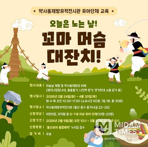 미담타임스 박민정 기자 | 울산 약사동제방유적전시관이 관내 어린이집과 유치원 원아(5세~7세)를 대상으로 머슴날(음력 2월 1일)과 관련한 교육 프로그램 ‘오늘은 노는 날! 꼬마 머슴 대잔치!’를 운영한다.