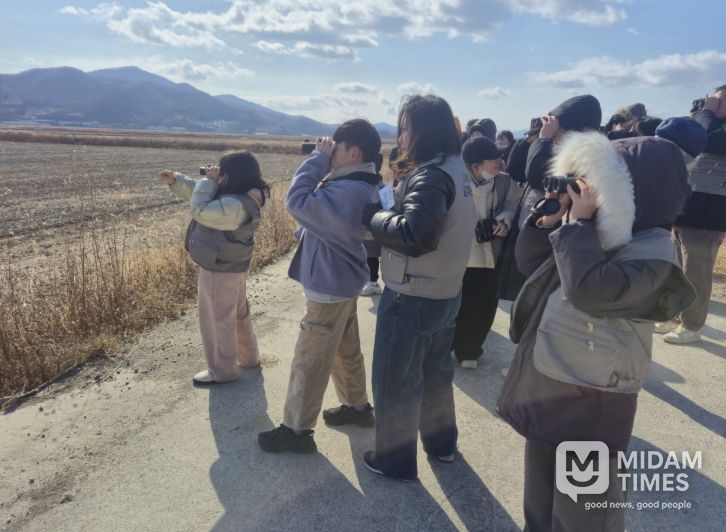 이날 프로그램은 탐조 전문가의 해설을 들으며 쌍안경으로 흑두루미, 왜가리, 민물가마우지 등 철새와 텃새를 관찰한 뒤, 자연물을 활용한 콜라주 기법의 ‘새 그리기 미술 활동’으로 이어졌다.