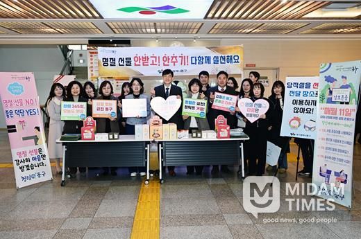 미담타임스 김교환 기자 | 대구 동구청은 지난 10일 구청 현관에서 설 명절을 앞두고 공직사회 청렴 의식을 제고하기 위해 출근길 직원들을 대상으로 청렴캠페인을 실시했다.