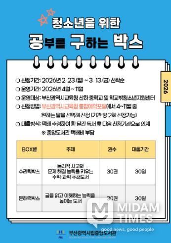 미담타임스 김교환 기자 | 부산광역시립중앙도서관은 청소년의 문해력과 수리력 향상을 돕기 위한 도서 단체 대출 서비스인 ‘청소년을 위한 공·구박스(공부를 구하는 박스)’를 운영한다.