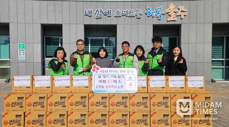 미담타임스 김준완 기자 | 온누리나눔회가 11일 설 명절을 맞아 울주군 온양읍 행정복지센터에 라면 50박스를 기탁했다.
