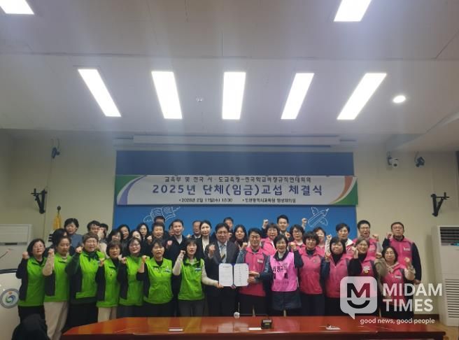 미담타임스 박민정 기자 | 울산광역시교육청을 포함한 전국 17개 시도교육청이 11일 인천광역시교육청에서 전국학교비정규직연대회의와 ‘2025년 집단 임금 교섭 체결식’을 열었다.