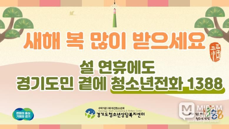 미담타임스 정주환 기자 | 경기도는 설 당일을 포함해 14~18일 연휴 기간에도 위기 청소년 심리 상담 서비스 ‘청소년전화1388’을 24시간 운영한다.