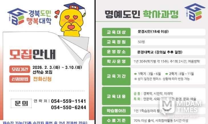 미담타임스 김준완 기자 | 문경시는 시민들에게 체계적이고 수준 높은 평생학습 기회를 제공하기 위해 2026년『경북도민행복대학 문경시캠퍼스』명예학사과정 입학생을 2월 3일부터 3월 10일까지 선착순 모집한다.