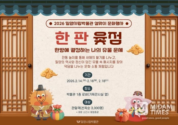 미담타임스 김교환 기자 | 경남 밀양시립박물관은 2026년 설 명절을 맞아 시민과 관람객들이 전통문화를 즐기며 화합할 수 있는 ‘설맞이 특별 체험 프로그램’을 운영한다.