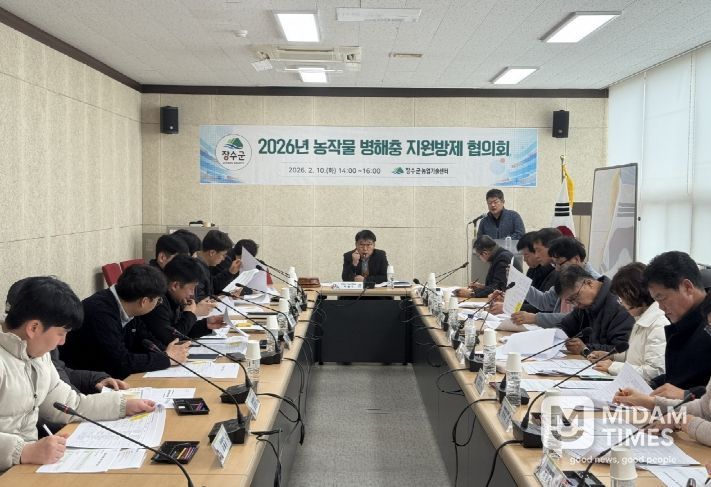 미담타임스 김준완 기자 | 장수군은 군 농업기술센터에서 농작물 병해충 선제적 대응을 위해 행정·농협·농업인단체 등 관계위원 17명이 참석한 가운데 ‘2026년 농작물 병해충 지원방제 협의회’를 개최했다고 13일 밝혔다.