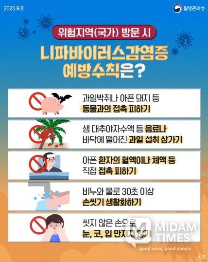 니파바이러스는 40~75%의 높은 치명률을 가진 바이러스로 사람 간의 전파가 가능하다. 이를 예방할 백신이나 치료제가 없어 각별한 주의가 요구되며 질병관리청은 지난해 9월 니파바이러스를 제1급 법정 감염병으로 지정해 전수 감시체계 속 철저하게 동향을 파악하고 있다.