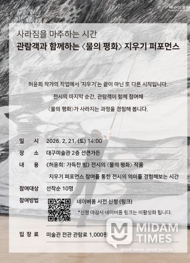 미담타임스 김교환 기자 | 대구문화예술진흥원 대구미술관은 제25회 이인성미술상 수상자전 “허윤희: 가득찬 빔”의 전시 종료를 앞두고, 출품작 ‘물의 평화’ 지우기 퍼포먼스를 관람객 참여 프로그램으로 진행한다.