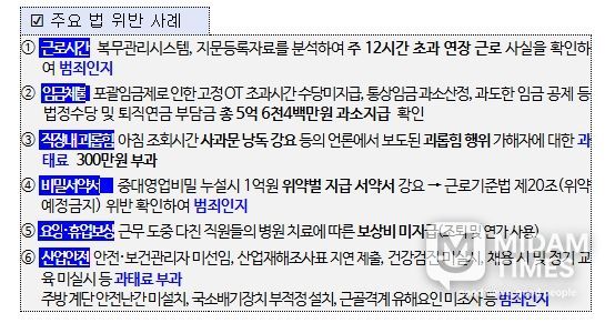 이와 함께 연장·야간·휴일근로 수당 등 임금 미지급 5억 6천4백만원에 대해서도 시정지시했다.