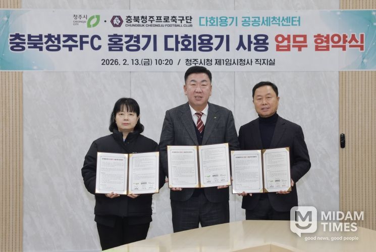 미담타임스 김준완 기자 | 청주시는 13일 충북청주 프로축구단(충북청주FC), 다회용기 공공세척센터와 함께 충북FC 홈경기 다회용기 사용 확대를 위한 업무협약을 체결했다.