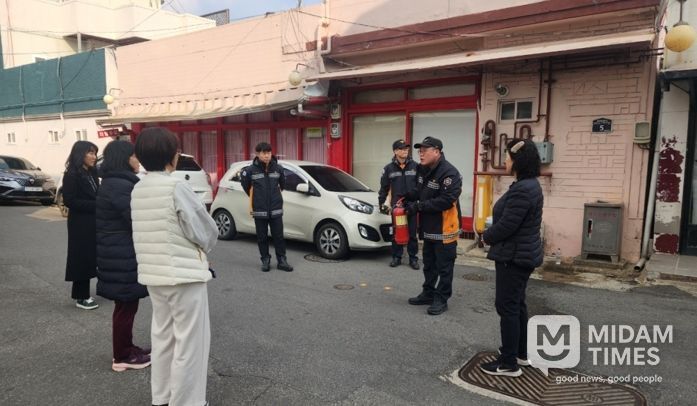 미담타임스 김준완 기자 | 포항북부소방서 덕산119안전센터 화재진압팀은 지난 11일 대흥동 성매매 집결지 현장시청 빛나길센터 앞에서 지역 주민을 대상으로 소방안전교육을 실시했다.