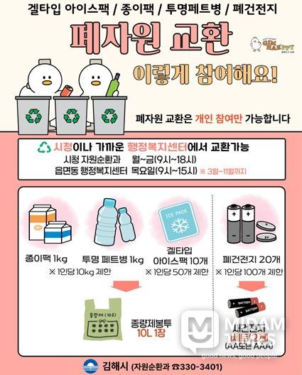 미담타임스 김준완 기자 | 김해시는 자원 재활용률을 높이고 시민들의 올바른 분리배출 문화 정착을 위해 오는 3월부터 ‘2026년 폐자원 교환사업’을 운영한다고 19일 밝혔다.