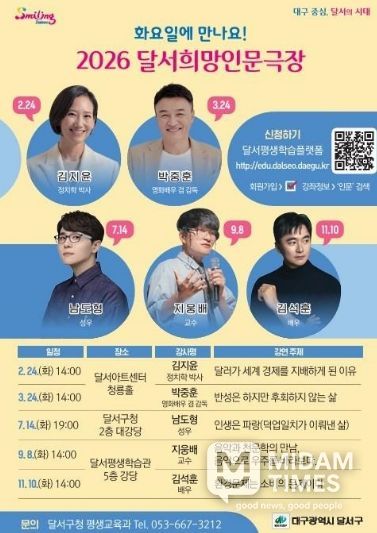 미담타임스 김교환 기자 | 대구 달서구는 2월 24일 오후 2시 달서아트센터 청룡홀에서 김지윤 정치학 박사의 강연을 시작으로 '2026 달서희망인문극장'을 본격 운영한다.