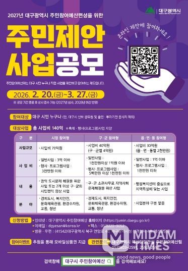 미담타임스 김교환 기자 | 대구광역시는 시민의 목소리를 시정에 직접 반영하기 위해 2월 20일부터 3월 27일까지 36일간 ‘2027년도 예산편성을 위한 주민제안사업’을 공모한다.