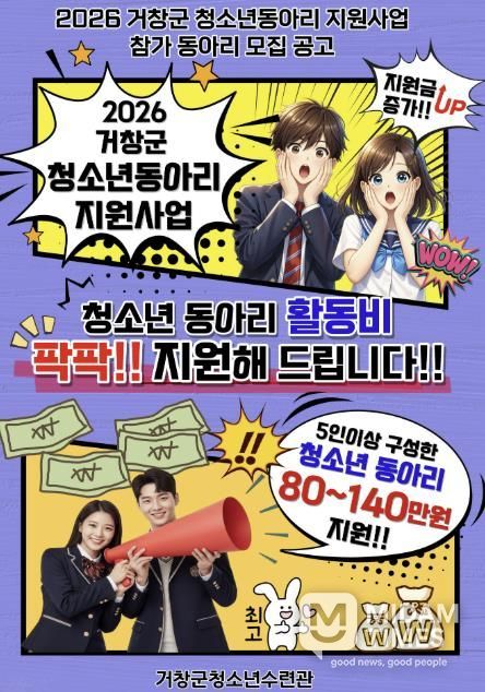 미담타임스 김교환 기자 | 거창군은 자발적이고 주체적인 청소년동아리 활동을 활성화하고 청소년들의 다양한 재능 계발과 진로 탐색 기회를 확대하기 위해 ‘2026년 거창군 청소년동아리 지원사업’에 참여할 동아리를 공개 모집한다.
