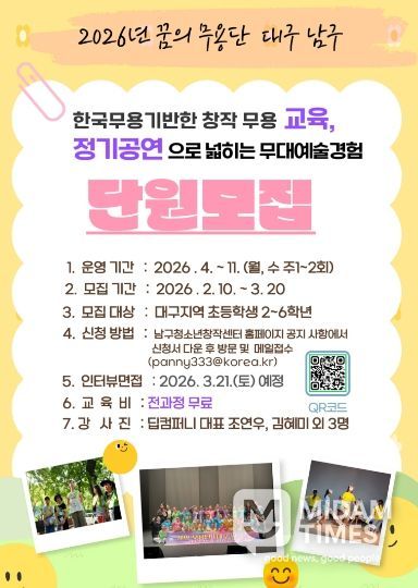 미담타임스 김교환 기자 | 대구 남구청소년창작센터에서 한국문화예술교육진흥원 공모사업으로 운영되는 '꿈의 무용단 대구 남구' 2기 단원을 모집한다고 밝혔다.