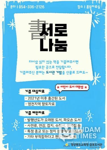 미담타임스 김준완 기자 | 경상북도교육청 금호도서관(관장 박경숙)은 2026년 도서 기증사업 '서(書)로 나눔'을 운영한다고 밝혔다. 이번 사업은 기증도서를 접수하고, 활용 가능한 도서를 필요한 곳에 다시 나누는 도서순환 나눔 사업이다.