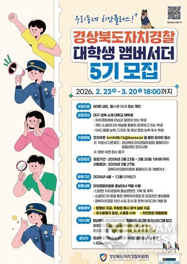 미담타임스 김준완 기자 | 경상북도자치경찰위원회는 대구⋅경북 지역 대학생을 대상으로 2월 23일부터 3월 20일까지 ‘경북자치경찰 대학생 앰버서더 5기’를 모집한다고 밝혔다.