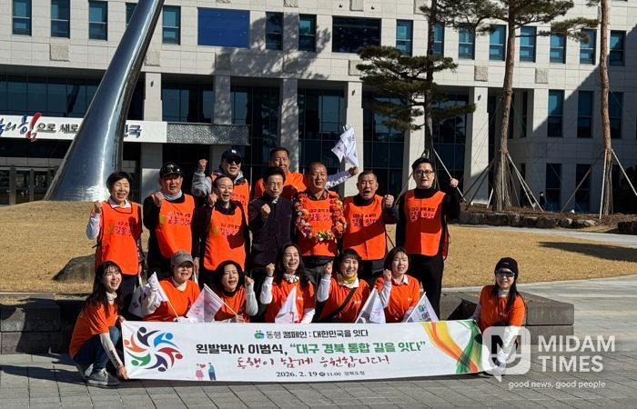 미담타임스 김준완 기자 | 이범식 박사와 대구경북통합 도보캠페인단은 ‘길을 잇다’라는 슬로건 아래, 2월 11일 대구 산격청사에서 출발해 칠곡, 군위, 의성을 거쳐 2월 19일 경북도청에 도착하는 총 140km의 도보캠페인을 마무리 했다.