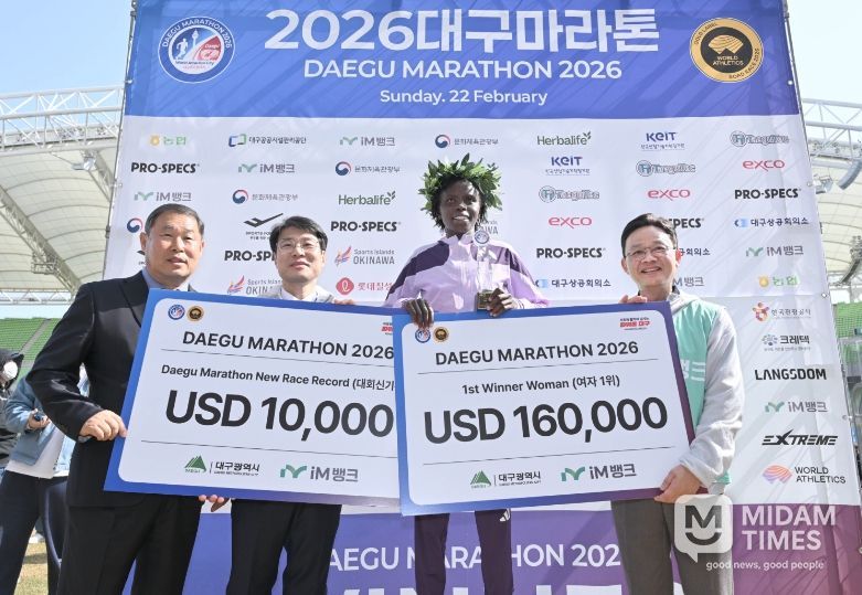 미담타임스 김교환 기자 | 2월 22일 대구스타디움에서 열린 ‘2026 대구마라톤’이 25회째를 맞아 코스를 재정비하고 운영 완성도를 높인 가운데, 여자부 대회 신기록과 남자부 대회 2연패 기록이 동시에 탄생했다.