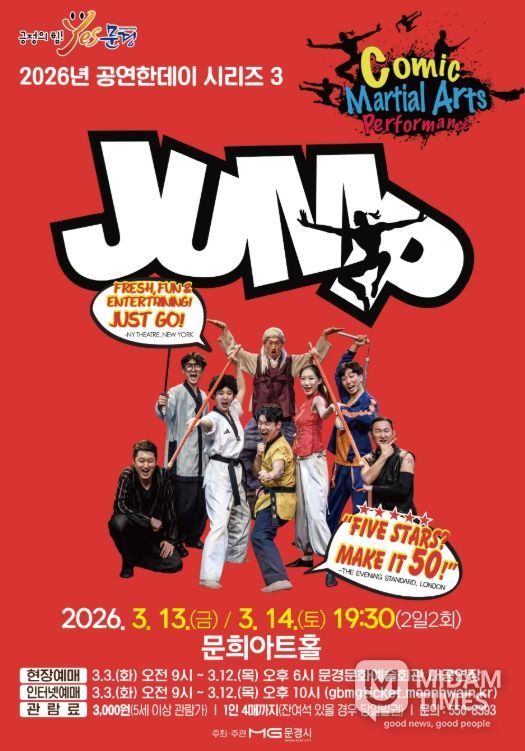 미담타임스 김준완 기자 | 문경문화예술회관에서는 화려한 공중회전을 선보이는 아크로바틱과 고난이도 동양 무예, 슬랩스틱 코미디가 어우러진 넌버벌 퍼포먼스 점프(JUMP) 공연을 3월 13일 19:30, 14일 19:30 (2일 2회)에 문희아트홀에서 개최한다.