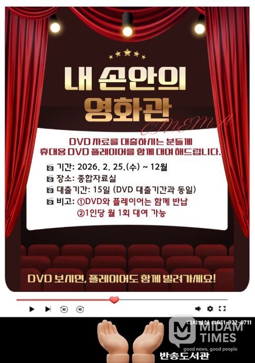 미담타임스 남혜영 기자 | 부산시교육청 반송도서관은 DVD 자료 이용 활성화를 위해 25일부터 12월까지 ‘내 손안의 영화관’ 프로그램을 운영한다.