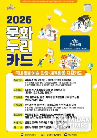 이미 카드를 발급받은 사람은 전년도 카드 사용 실적이 3만 원 이상이고, 올해도 수급 자격을 유지할 경우 별도의 신청 없이 지원금이 기존 카드에 충전된다. 자동충전이 완료된 대상자에겐 알림 문자가 발송되며, 전국 읍․면․동 주민센터와 ‘문화누리카드’ 누리집, 전화, 모바일 앱 등을 통해서도 충전 여부와 사용 현황을 확인할 수 있다.