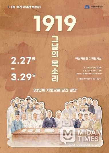 미담타임스 남혜영 기자 | 부산 중구는 제107주년 3·1절을 맞아 오는 2월 27일부터 3월 29일까지 백산기념관 기획전시실에서 '1919 그날의 목소리, 33인이 서명으로 남긴 결단'특별전을 개최한다.