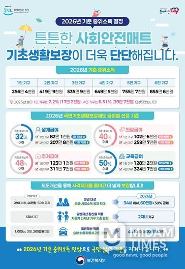 2026년 기준중위소득이 전년 대비 6.51% 인상되면서, 4인 가구 기준 소득인정액이 월 207만 8,320원 미만인 가구는 생계급여를 받을 수 있게 된다.