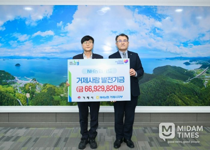 미담타임스 황명수 기자 | 거제시는 2월 23일 NH농협은행 거제시지부로부터 2025년도 NH농협카드 이용에 따른 제휴카드 적립 기금 66,929,820원을 전달받았다고 밝혔다.