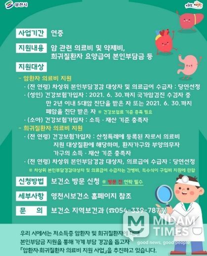 미담타임스 김준완 기자 | 영천시는 경제적 부담으로 치료를 포기하는 일이 없도록 암환자와 희귀질환자를 대상으로 한 의료비 지원사업을 연중 추진한다고 24일 밝ㅈ혔다.