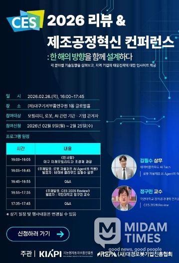 미담타임스 전해찬 기자 | 대구광역시는 2월 26일 오후 4시, 대구기계부품연구원 글로벌홀에서 ‘CES 2026 리뷰·제조공정혁신 컨퍼런스’를 개최한다.