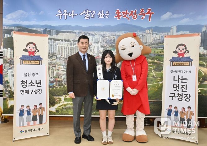 미담타임스 김준완 기자 | 울산 중구가 2월 24일 성신고등학교 1학년 김하은 학생을 ‘1일 청소년 명예구청장’으로 위촉했다.