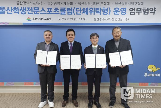 미담타임스 박민정 기자 | 울산광역시교육청은 24일 접견실에서 울산광역시체육회(회장 김철욱), 울산광역시태권도협회(회장 김화영), 울산광역시탁구협회(회장 윤철진)와 ‘울산 전문학생스포츠클럽’ 전환을 위한 업무협약을 맺었다.