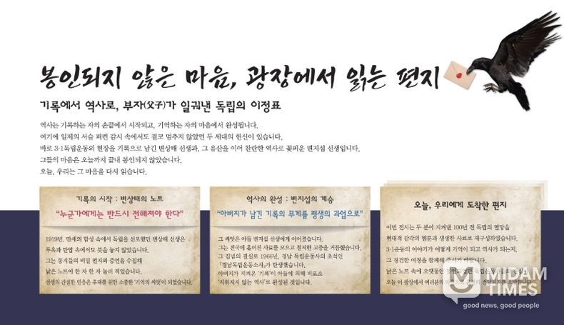 미담타임스 황명수 기자 | 경상남도기록원은 제107주년 3·1절을 맞아 일제의 엄혹한 감시 속에서도 꺼지지 않았던 독립의 기록을 현대적 예술로 재해석한 특별전 '봉인되지 않은 마음, 광장에서 읽는 편지'를 개최한다.