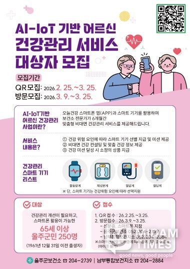 미담타임스 김준완 기자 | 울주군보건소가 지역 어르신의 건강한 노후를 위해 스마트 기술을 접목한 ‘AI·IoT 기반 어르신 건강관리사업’을 실시한다고 25일 밝혔다.