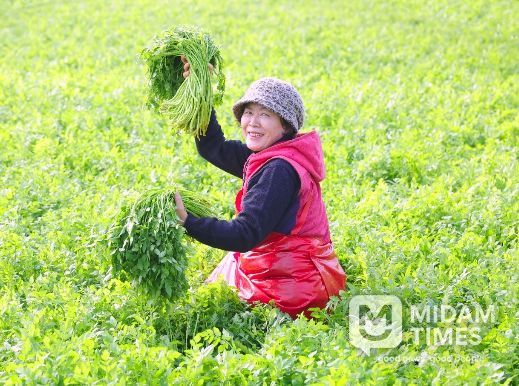 미담타임스 황명수 기자 | 25일 경남 함양군 백전면 백운리 윗 새재농원 시설하우스에서 홍정표씨가 고랭지 지하암반수로 재배해 수확한 청정 밭미나리를 들어 보이고 있다. 이곳 백운산 자락에서 자란 미나리는 해발 600m에서 친환경적으로 재배해 향이 진하며 줄기가 부드럽고 아삭한 식감이 일품이다.