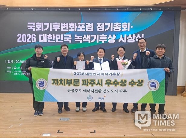 미담타임스 김준완 기자 | 파주시는 2월 25일 여의도 국회 국회의원회관에서 열린 ‘2026 대한민국 녹색기후상’ 시상식에서 자치부문 우수상을 수상했다.